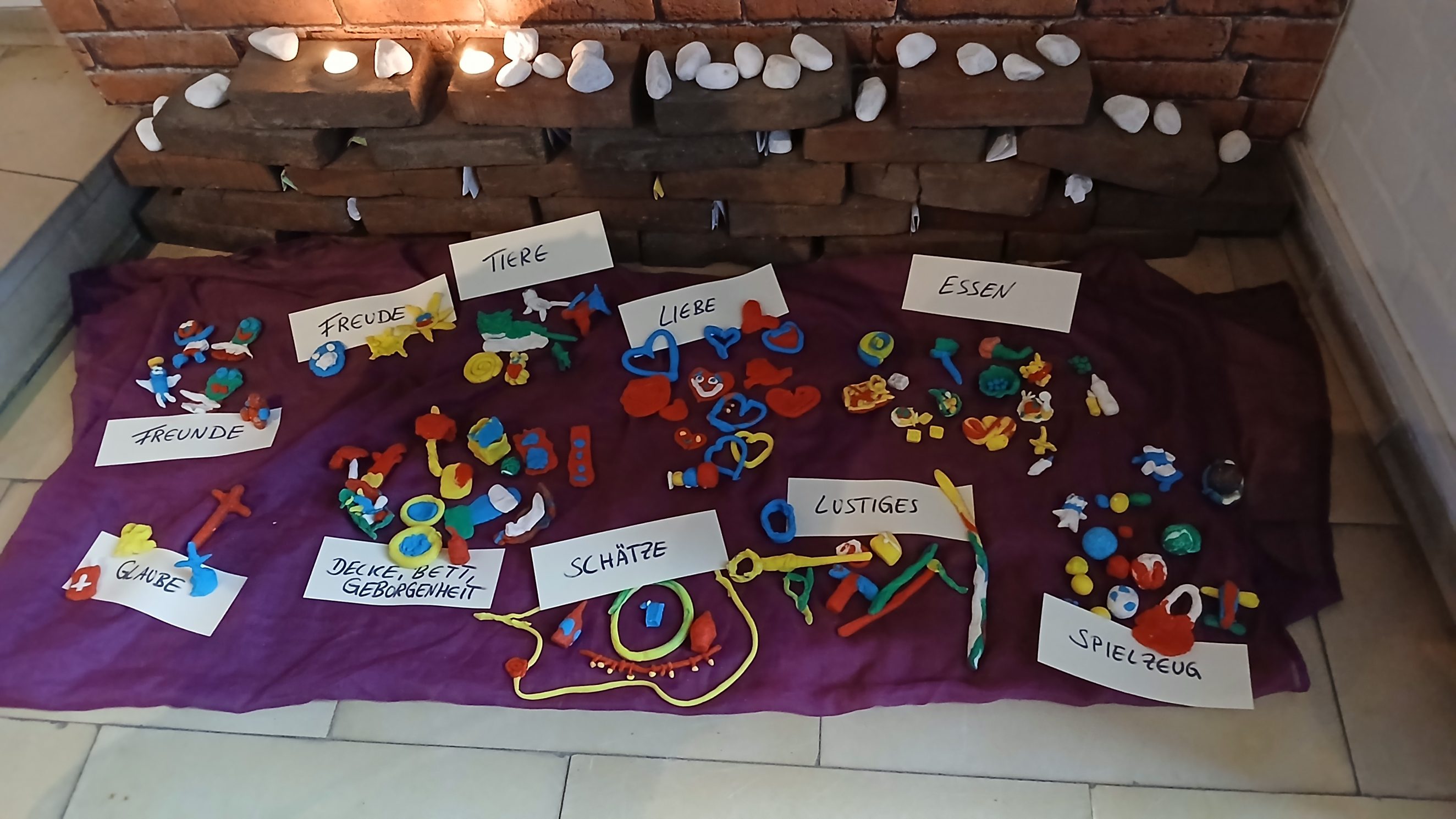 Das Thema des Familiengottesdienstes lautete "Geschenk gesucht!" Die verschiedenen Stationen konnten von Alt und Jung bestaunt werden! Aber auch "Mittun" war gewünscht. So entstanden einige Dinge aus Knete - im Bild zu sehen.
