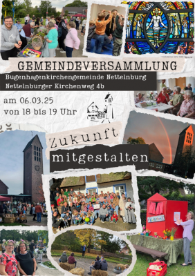 Alle Mitglieder der Bugenhagen-Kirchengemeinde sind eingeladen, am 06.03. um 18:00 Uhr in den Gemeindesaal zur Gemeindeversammlung zu kommen. Im Anschluss an den Bericht des Gemeinderates, gibt es die Möglichkeit zum Austausch bei einem kleinen Imbiss.
